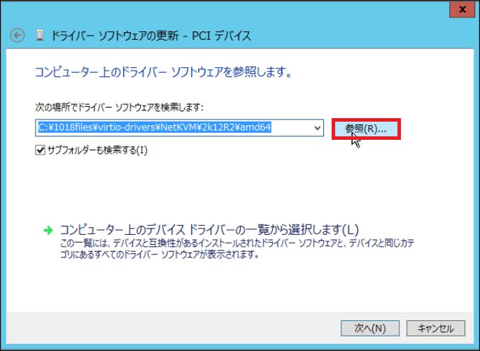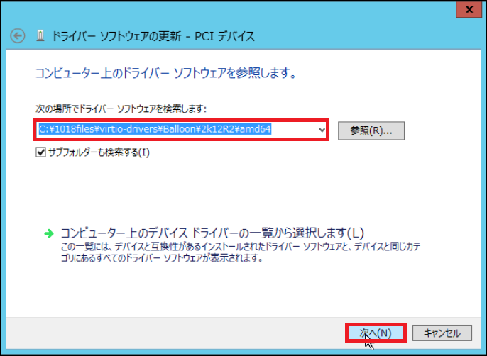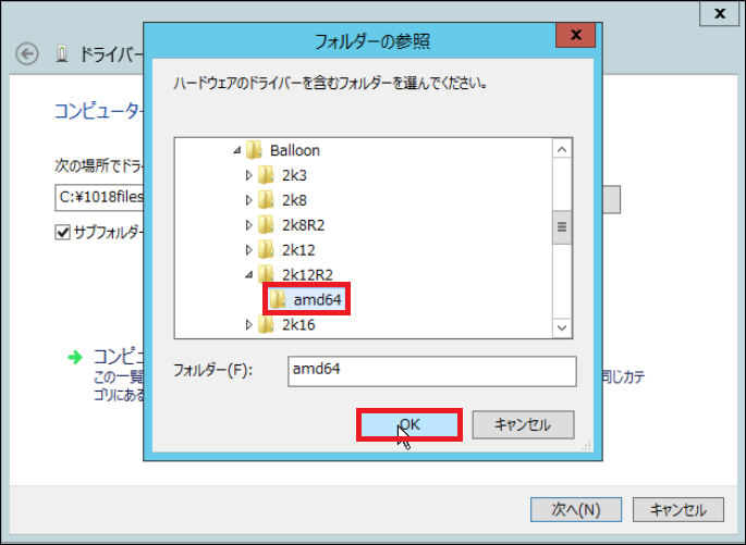 ドライバーファイル(virtio-win iso内のBalloon2k12R2amd64)選択し、「OK」をクリックします。