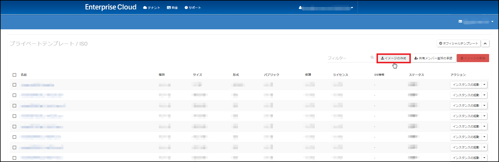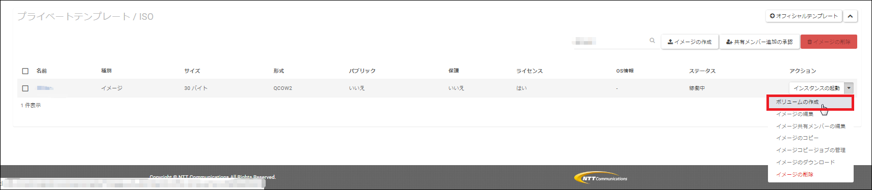 1.次に、リストア先となるボリュームの作成します。上記で作成したイメージの項目から下記のように「ボリュームを作成」を選択します。