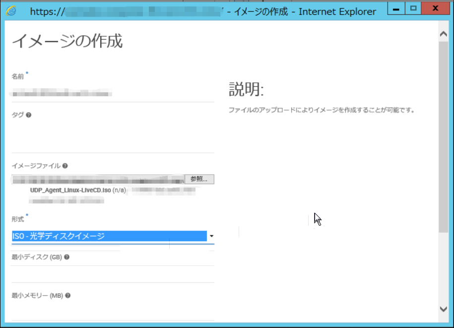 サイズ(GB):バックアップ元と同等または大きいサイズを選択。