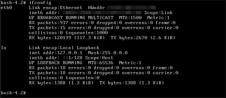 以下の例ではeth0のインターフェースが使用可能で、IPアドレスが設定されていないことが確認できます。