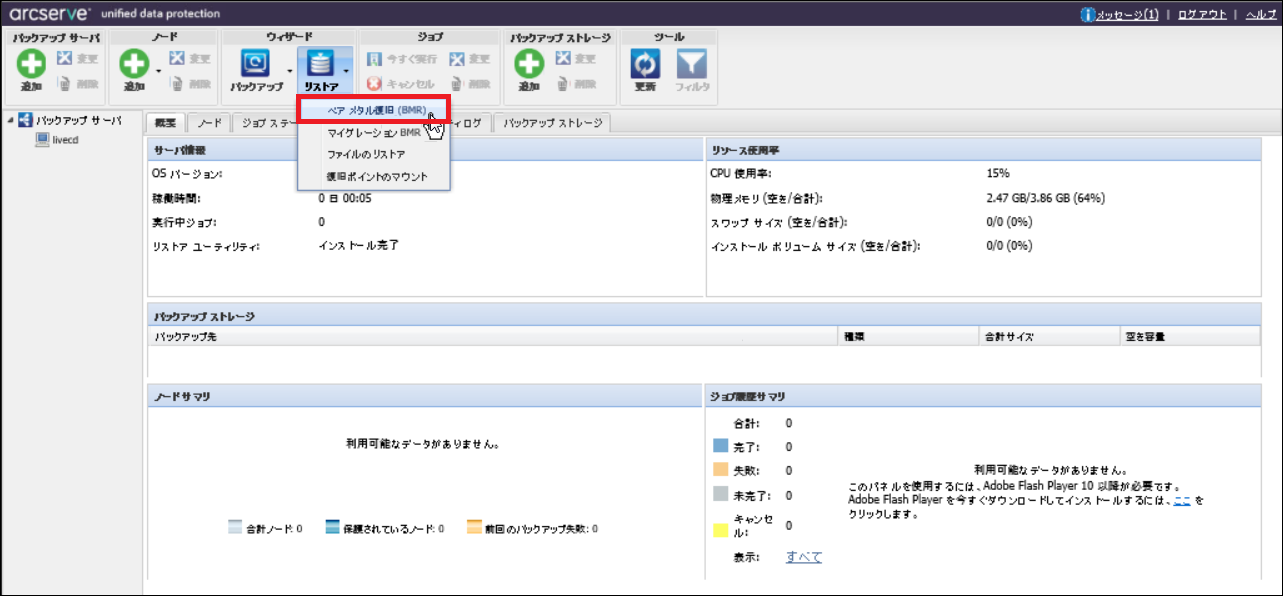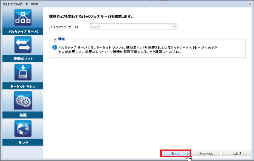 12.「リストア」をクリックし、ベアメタル復旧を選択します。