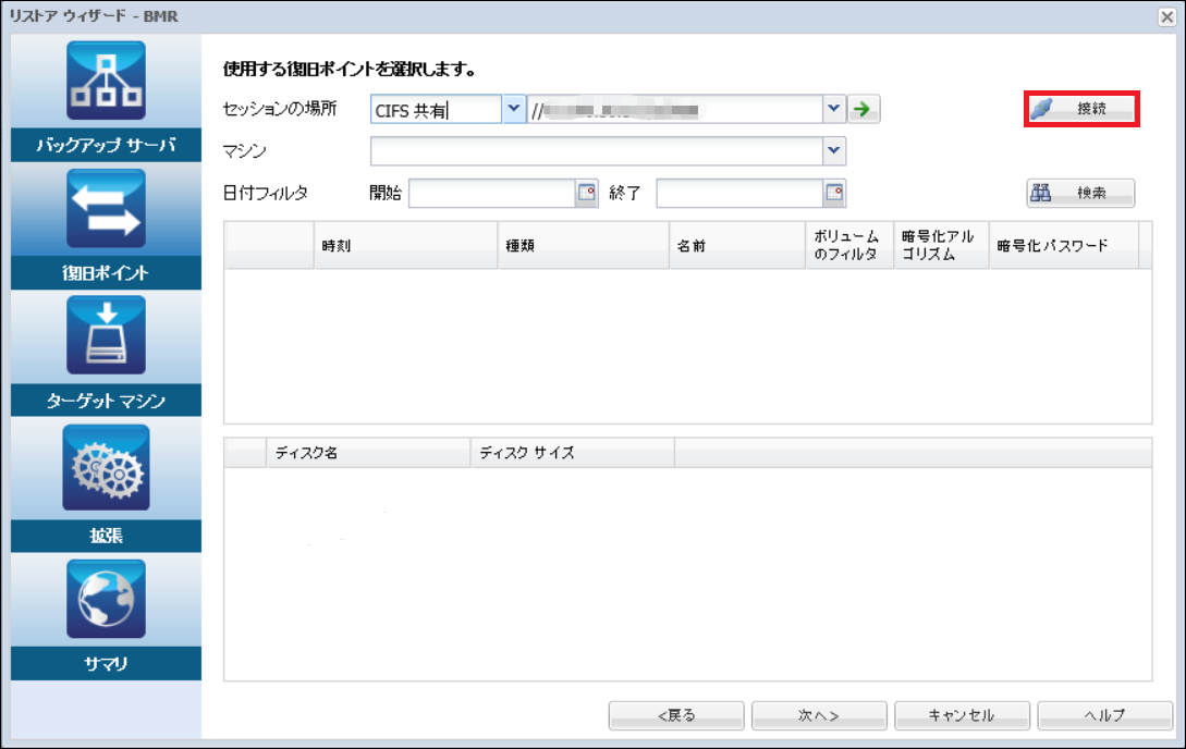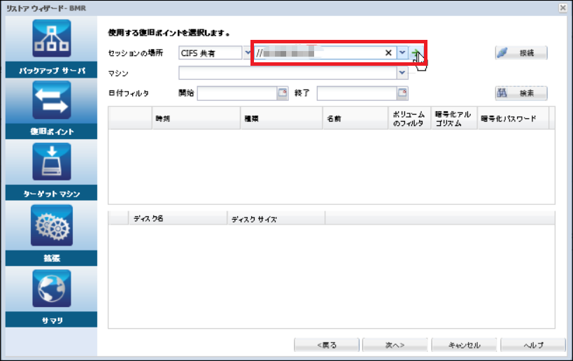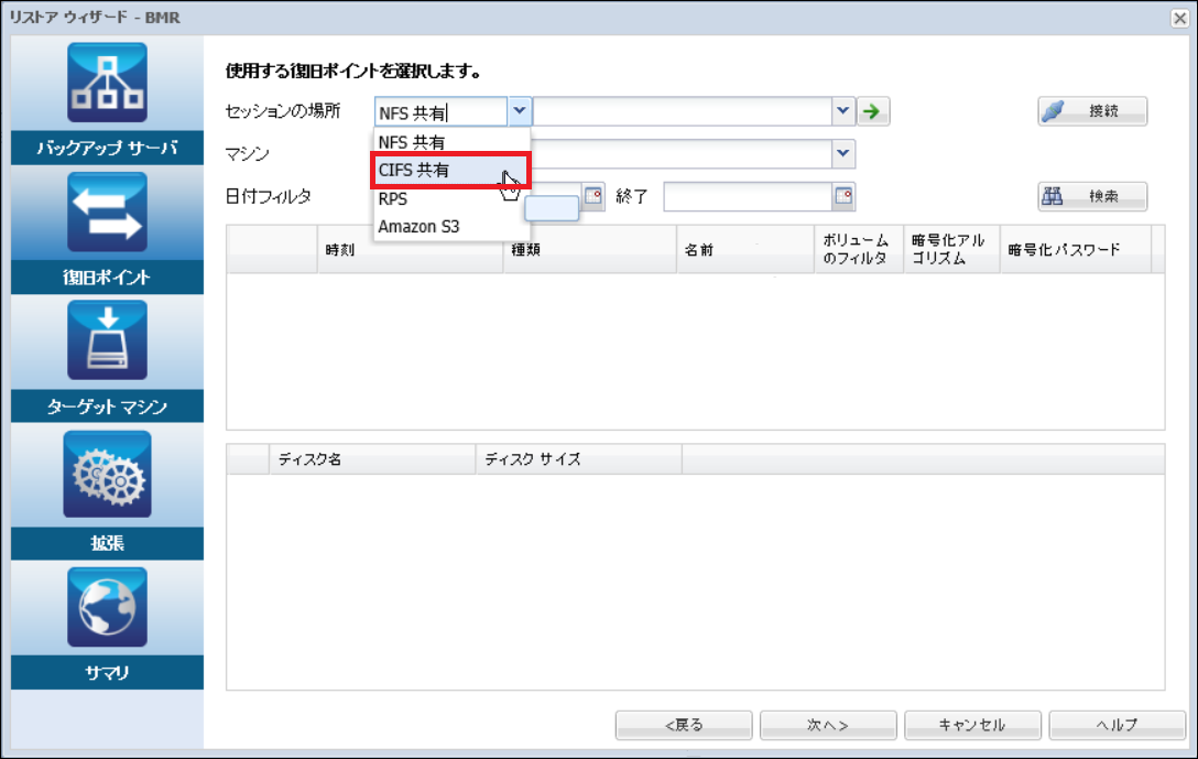 14.バックアップ保存先ストレージを選択します。本事例ではサーバーインスタンス(Windows)上の共有フォルダを保存先としていたため、CIFS共有を選択します。