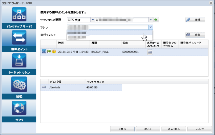 18.保存先フォルダに保存されているバックアップサーバのIPアドレスが表示されますので、対象サーバのIPアドレスを選択します。
