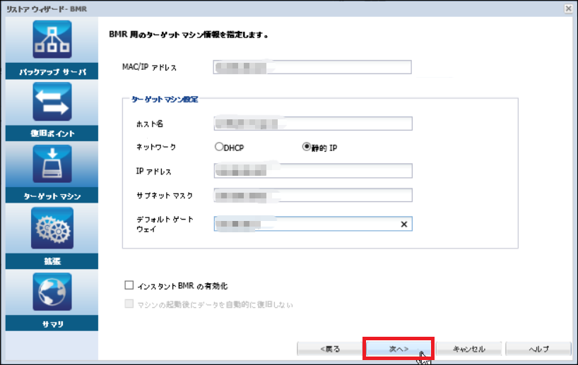 IPアドレス:最終的にリストアされるサーバに設定するIPアドレス