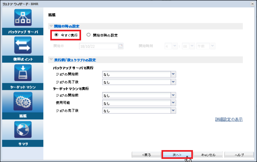 22.開始日時の設定にて、「今すぐ実行」を選択し、「次へ」をクリックします。