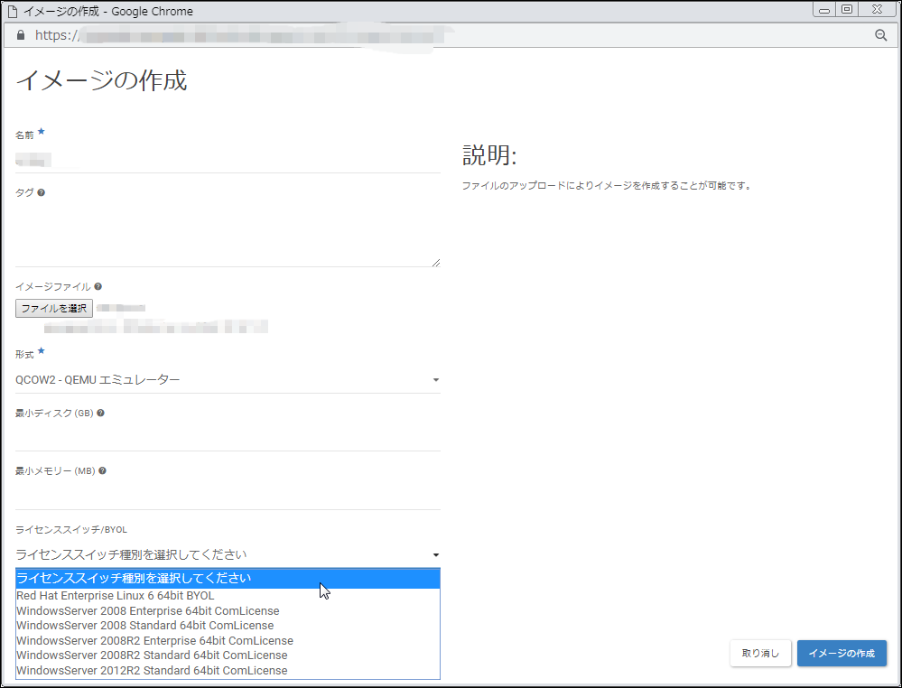 イメージをソースとして使用する:上記で作成されたイメージを選択(ライセンススイッチ/BYOLを適用するため必ず選択してください)。