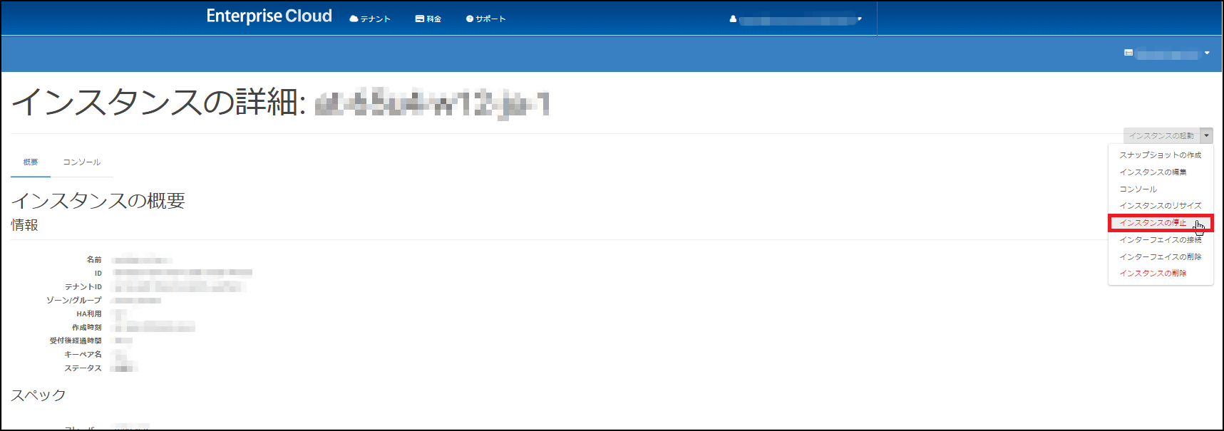 1.作成したリストア用の一時インスタンスを起動し、インスタンス名の項目をクリックしてインスタンスの画面を表示します。
