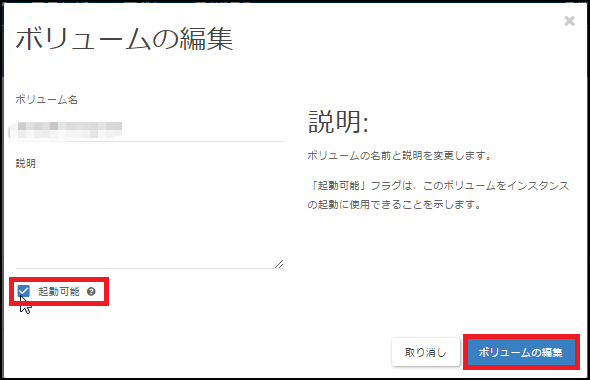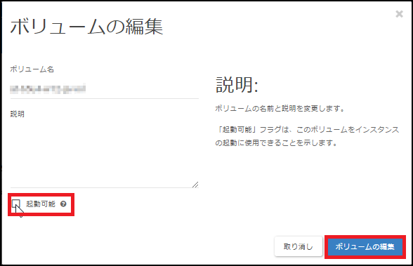 6.ボリュームの編集で「起動可能」にチェックを入れ、「ボリュームの編集」をクリックします。