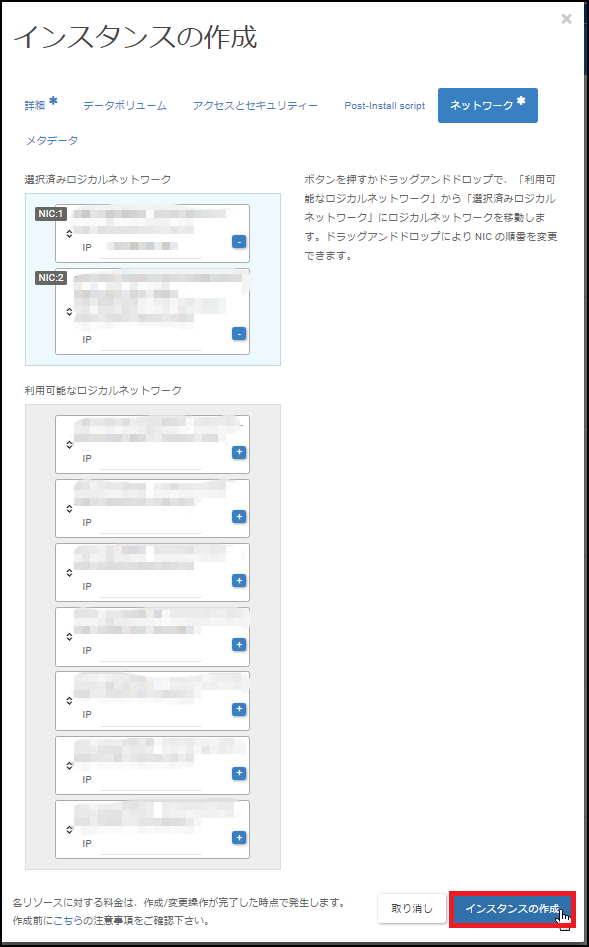 利用可能なロジカルネットワークからこのインスタンスに設定するIPアドレスを選択し、選択済みロジカルネットワークにIPアドレスを設定します。