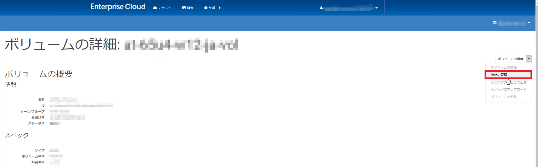 3.上記で作成したボリューム(上記のArcserveでリストアしたボリューム)の管理画面の右端「▼」をクリックして、「接続の管理」を選択します。