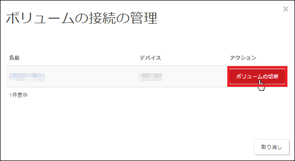 4.「ボリュームの接続」画面が開きますので、アクションの「ボリュームの切断」をクリックしてボリュームを切断してください。