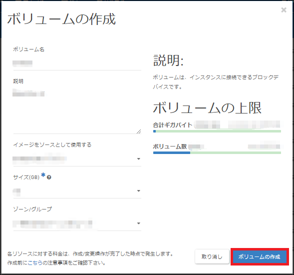 3.以下を入力/選択しボリュームの作成をクリックします。