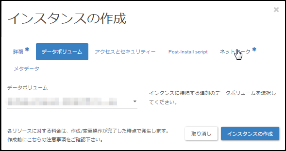 インスタンスの作成画面が表示されるので、各タブにて設定項目を記入します。