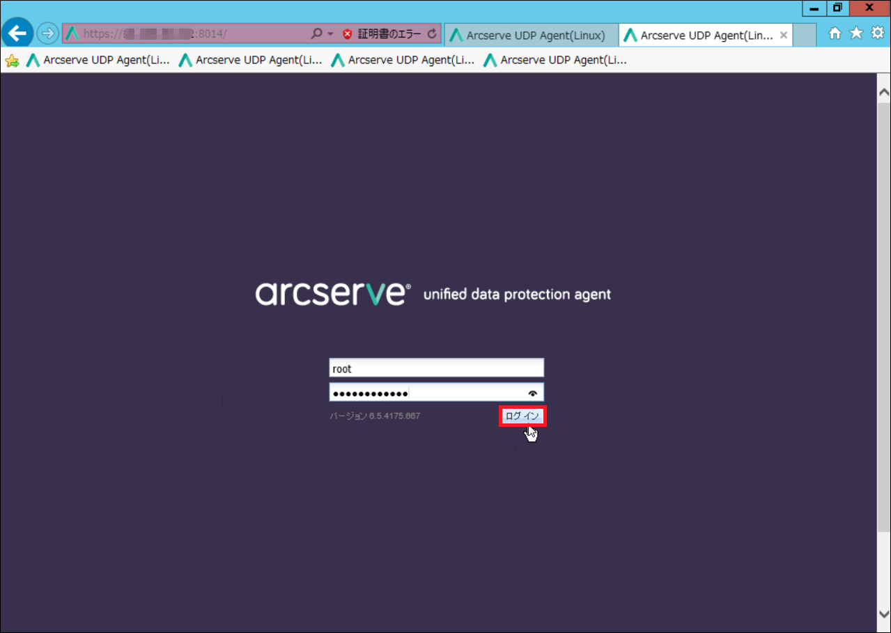 2.https ://[arcserveがインストールされたバックアップ対象linuxサーバのIPアドレス]:8014を入力実行します。