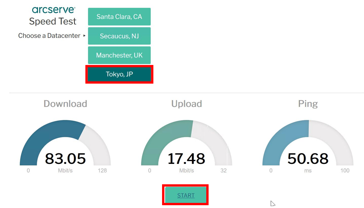 - Arcserve Speed Testバックアップ対象サーバーから「https://speedtest-sc.arcserve1.com/」にアクセスし、ご利用になるデータセンターを選択後、[START]をクリックすると[START]が[ABORT]に変化し測定が開始されます。[ABORT]が[START]に変化すると測定が完了します。