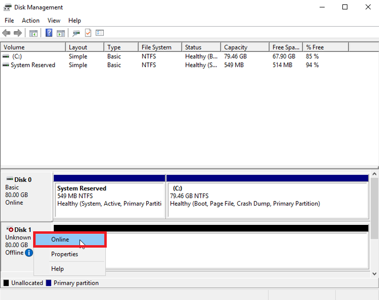 「Disk Management」画面にて[Disk 1]を右クリックし、[Online]をクリックします。