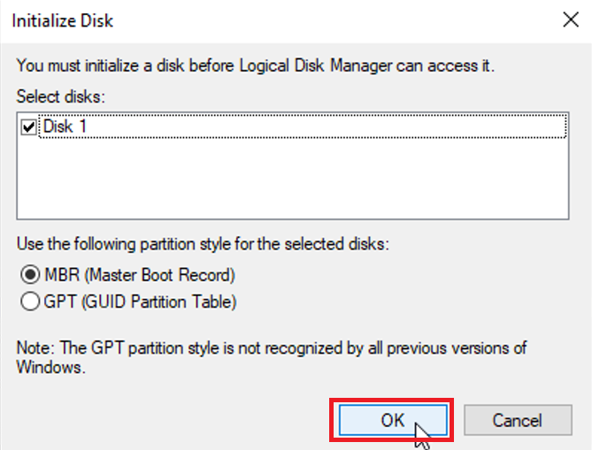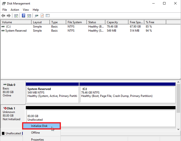 [Disk 1]を右クリックし、[Initialize Disk]をクリックします。