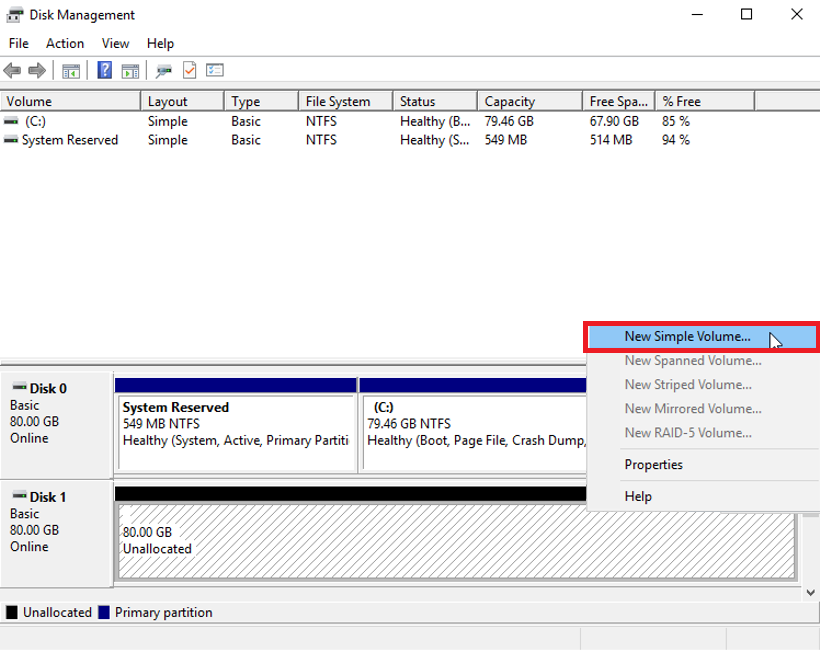 未割り当てのディスクを右クリックし、[New Simple Volume]をクリックします。