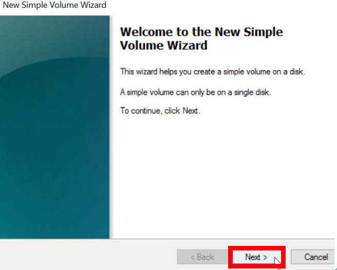 「New Simple Volume Wizard」画面が表示されたら[Next>]をクリックします。