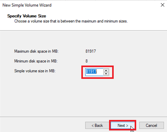 割り当てるボリュームサイズを確認して[次へ(N)>]をクリックします。