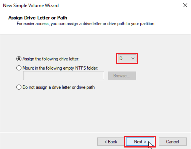「Assign the following drive letter:」に[D]が選択されていることを確認し、[次へ(N)>]をクリックします。