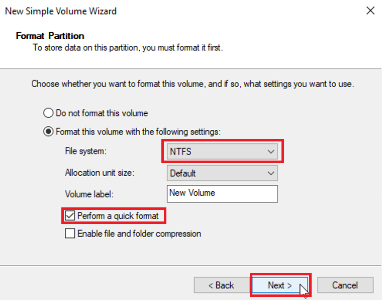 「File system:」が[NTFS]であること、[Perform a quick format]がチェックされていることを確認し、[NEXT>]をクリックします。