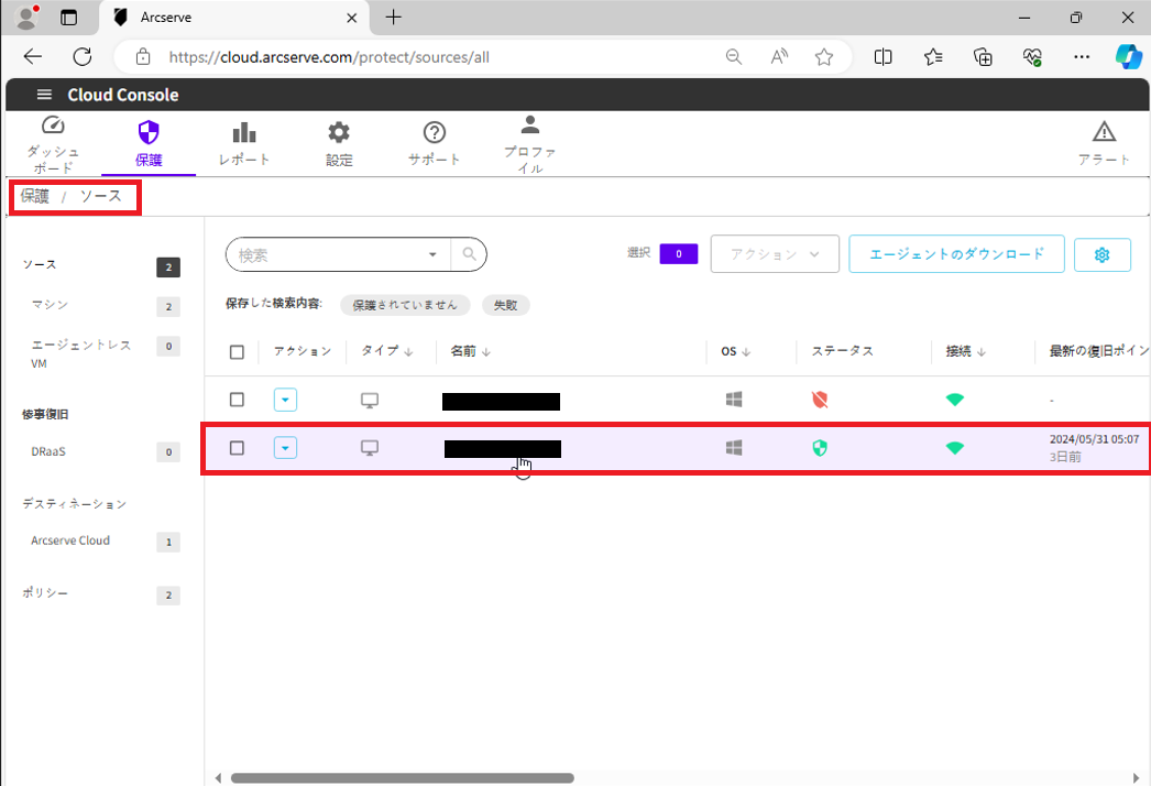 「ソース」画面にてリストアを実施するサーバー名をダブルクリックします。
