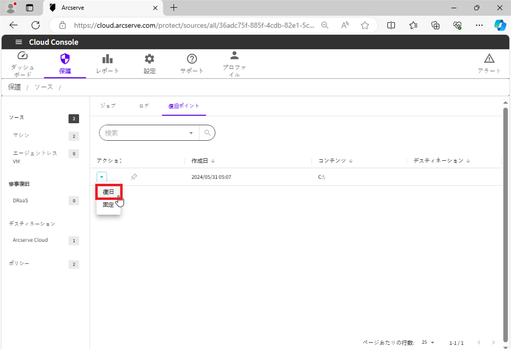 [復旧ポイント]を選択し、リストアしたいドライブの復旧ポイントにて[アクション]欄から、[復旧]をクリックします。