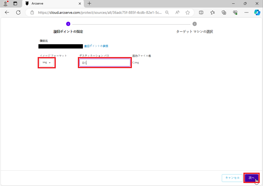 「復旧ウィザード」画面にて「イメージフォーマット」で[img]を選択し、「ディスティネーション パス」に本項目の①で作成したボリュームのパスを指定後、[次へ]をクリックします。