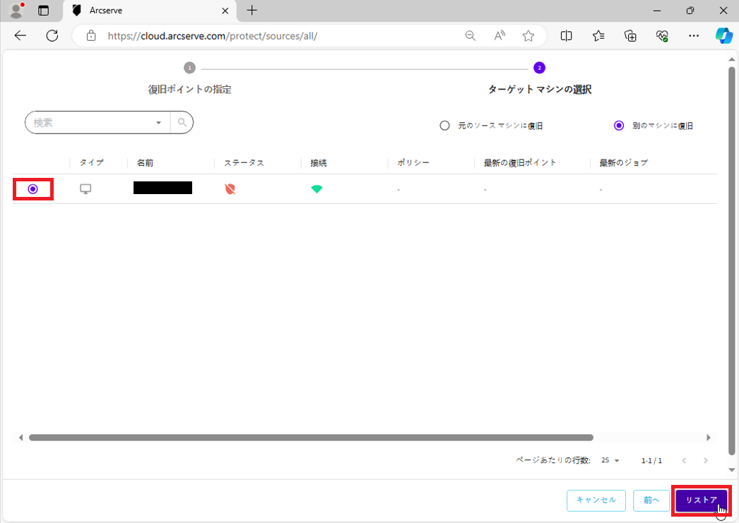 「ターゲットマシンの選択」画面にて、①で作成したボリュームが接続されているサーバーを選択し、[リストア]をクリックします。