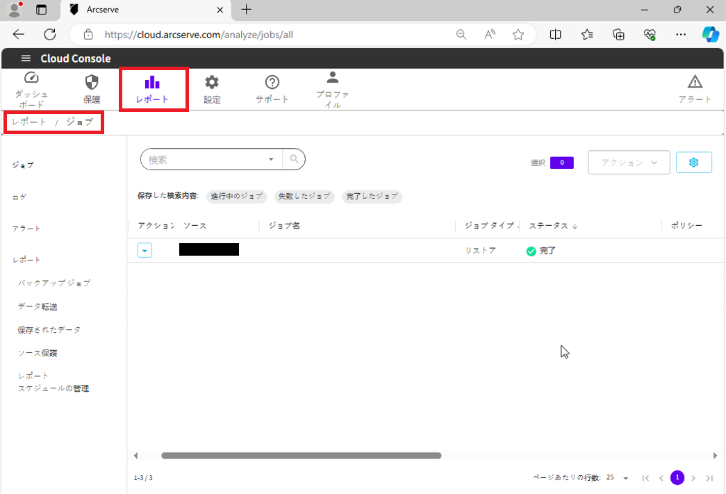 [分析]を選択し、リストアを実行しているジョブの「ステータス」が「完了」になるまで待機します。