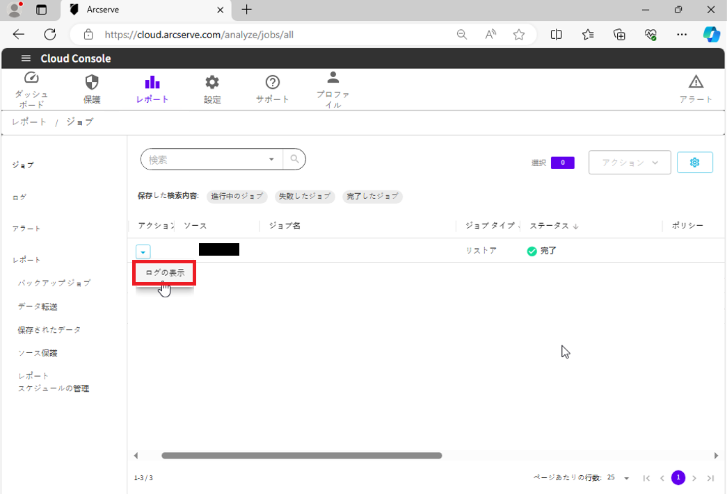 リストアが完了したジョブの[アクション]欄から[ログの表示]をクリックします。
