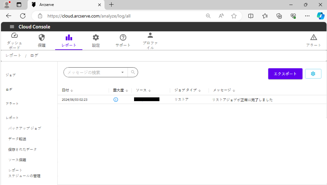 「ログ」画面の、[メッセージ]欄でリストアジョブが正常に完了していることを確認します。