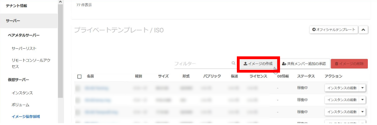 リストア用のボリュームが接続されているサーバーにてブラウザでECLのポータルサイトを開きます。その後「イメージ保存領域」へ移動し、[イメージの作成]をクリックします。