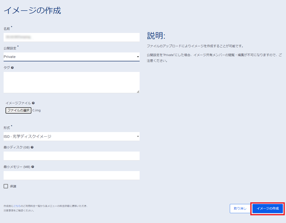 - 「イメージの作成」画面にて下記を入力し、[イメージの作成]をクリックします。・名前:任意のイメージ・イメージファイル:リストア用のボリュームに保存したC.img・形式:ISO -光学ディスクイメージ