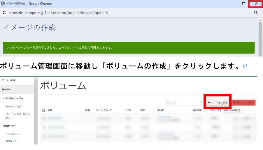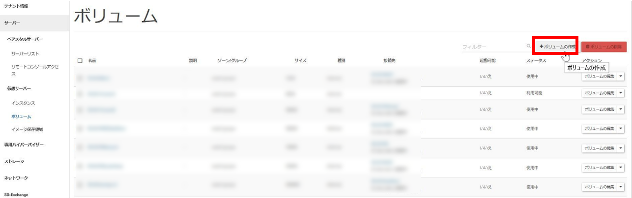 - リストアイメージを保存する一時設置サーバーを作成します。[サーバー]タブの「ボリューム」画面から[ボリュームの作成]をクリックします。