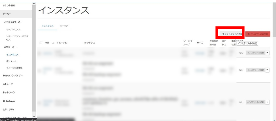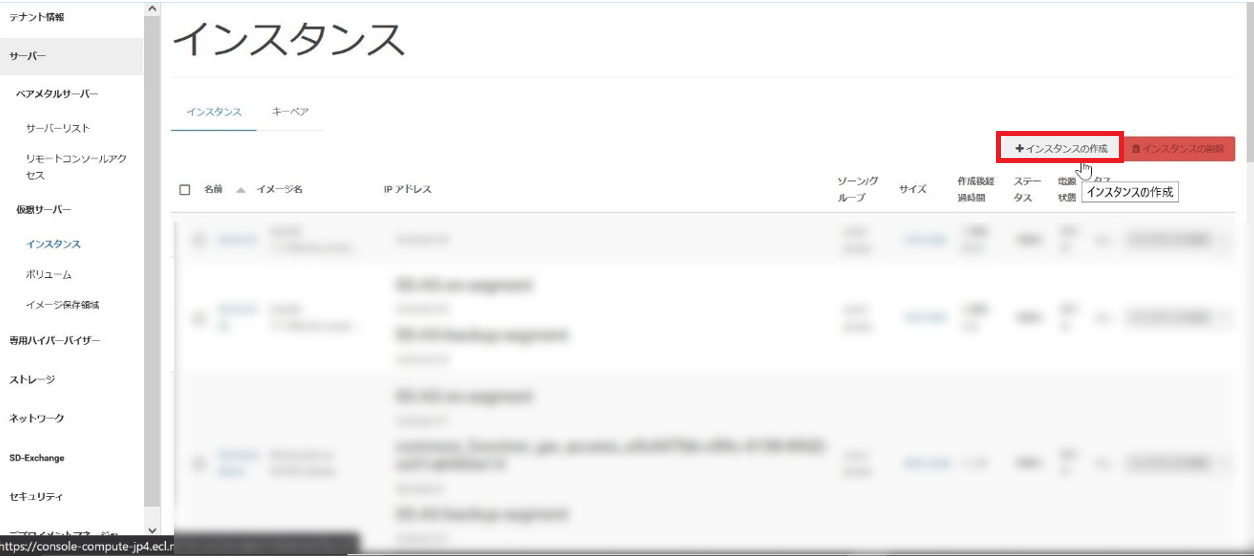 - 「インスタンス」画面にて、[インスタンスの作成]をクリックします。