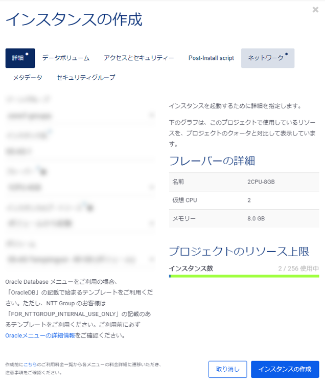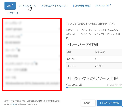 - 「インスタンスの作成」画面にて下記を入力します。・ゾーン/グループ:使用するゾーンを選択・インスタンス名:任意の名前を入力・フレーバー:必要なスペックを選択・インスタンスのブートソース:「ボリュームから起動」を選択・ボリューム:本章で作成したボリュームを選択