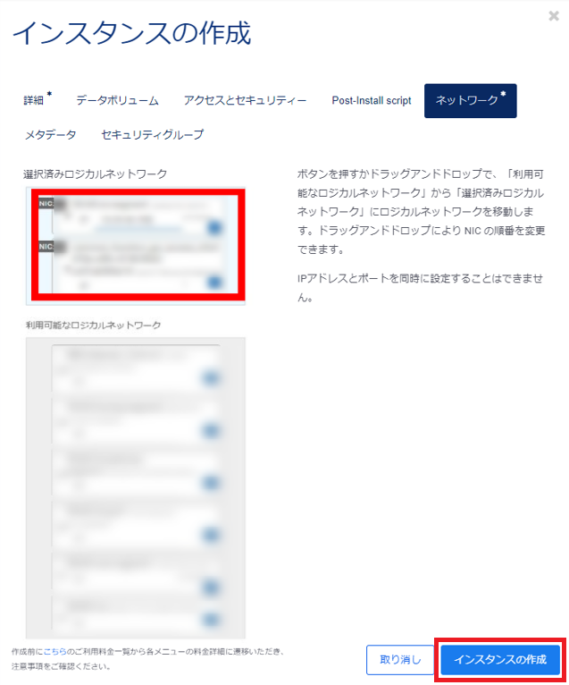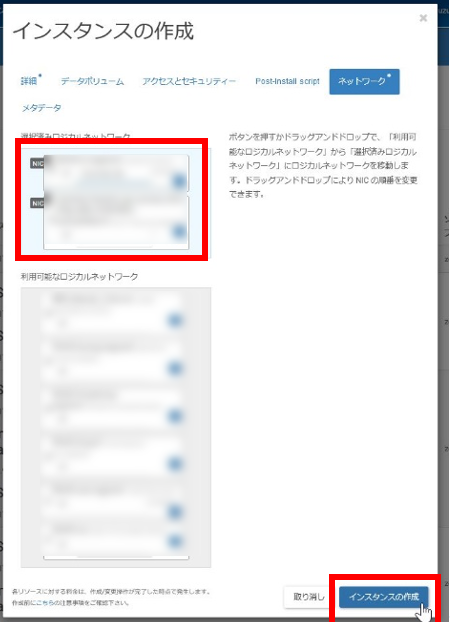 [ネットワーク]タブにて接続するネットワークとIPアドレスを入力後、[インスタンスの作成]をクリックします。