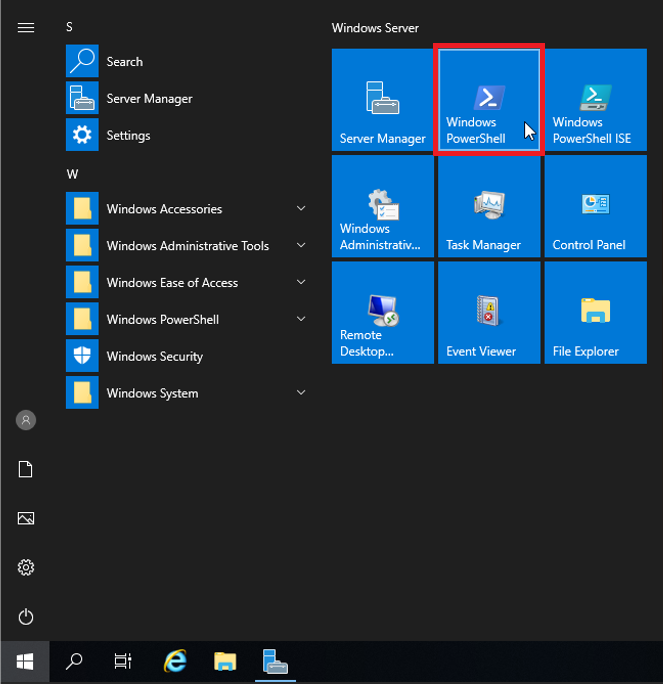 - リストアしたサーバーへログインします。[Windowsアイコン]をクリックし、[Windows Power Shell]をクリックします。