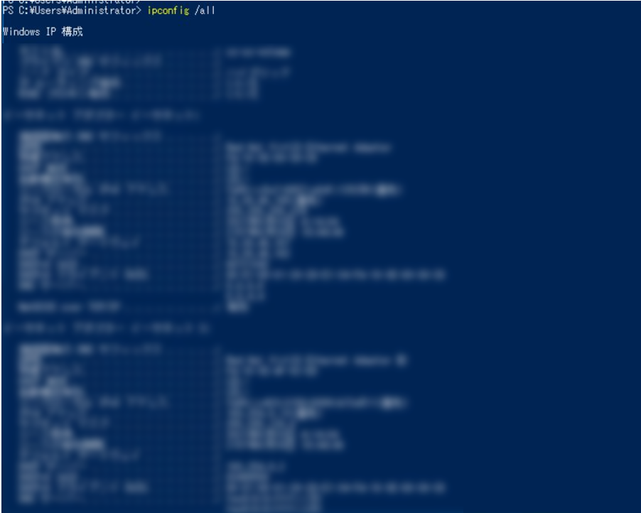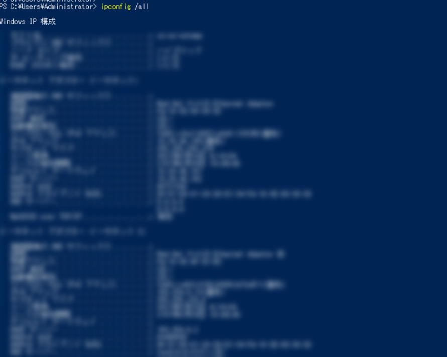 Windows Power Shellにて「ipconfig /all」コマンドを実行し、インターフェースの設定を確認します。