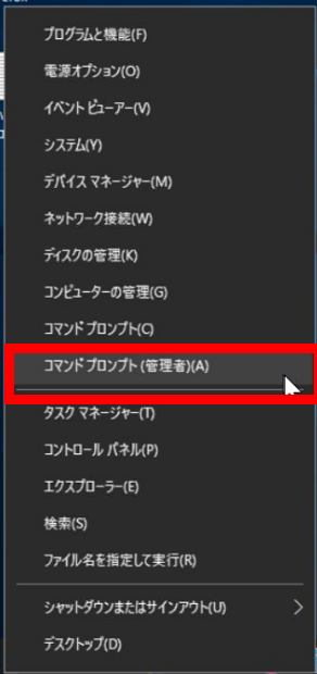 [Windowsアイコン]を右クリックし、[コマンドプロンプト(管理者)(A)]をクリックします。