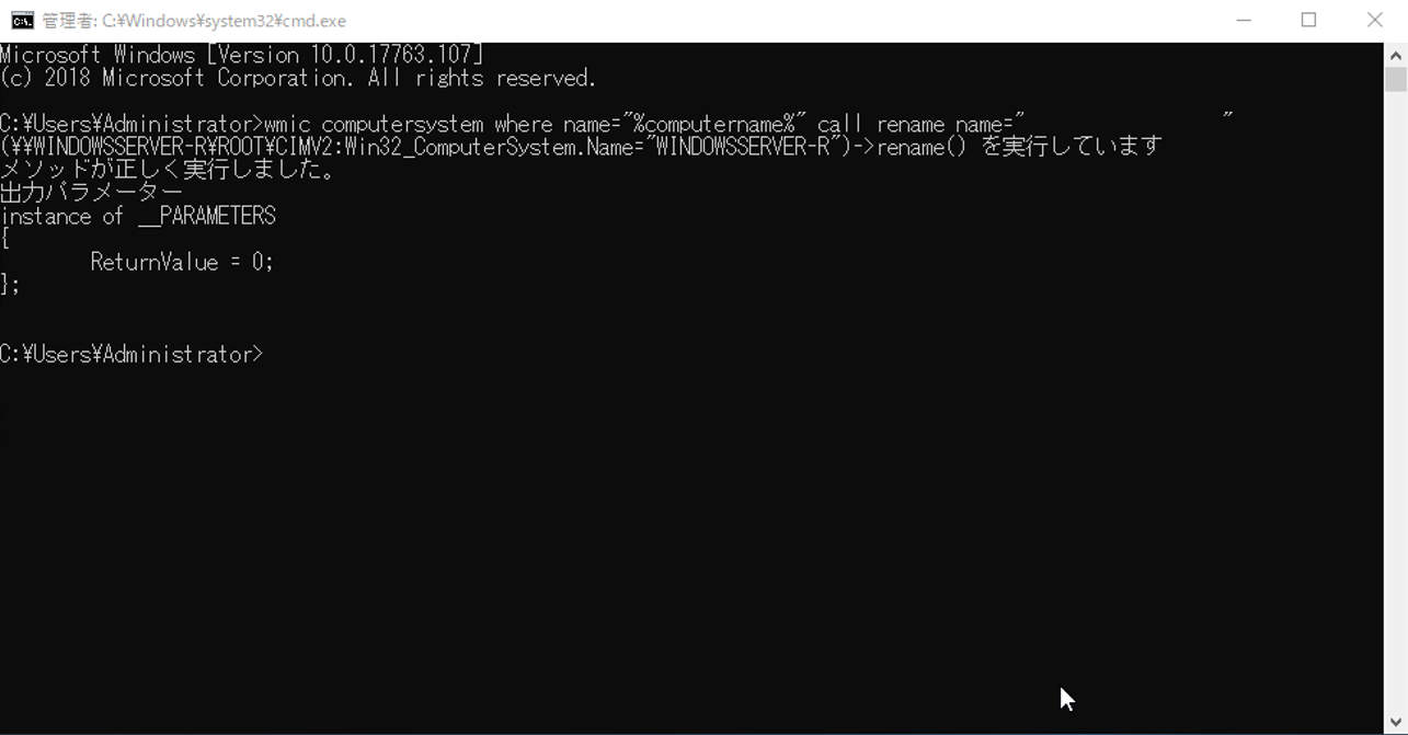 コマンドプロンプトにて「wmic computersystem where name=”%computername%” call rename name=”<ホスト名>“」を実行し、「メソッドが正しく実行しました」の文字を確認後、サーバーを再起動します。
