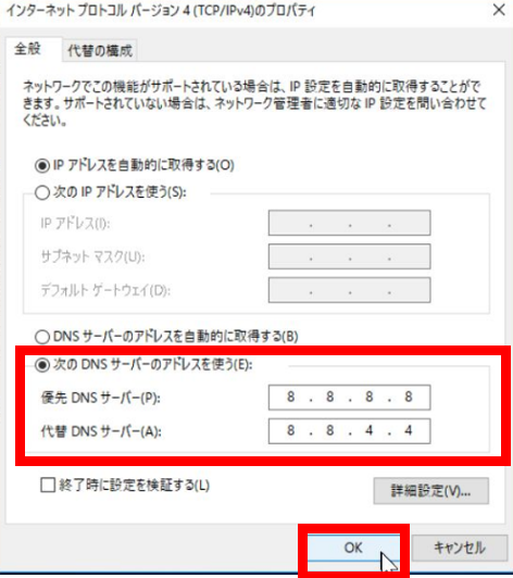 [次のDNSサーバーのアドレスをつかう(E)]にチェックを入れ、DNSサーバーを設定し、[OK]をクリックします。
