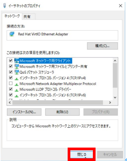 「イーサネットのプロパティ」画面にて[閉じる]をクリックします。
