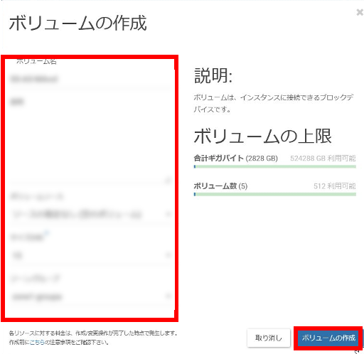 「ボリュームの作成」画面にて下記を入力して[ボリュームの作成]をクリックします。