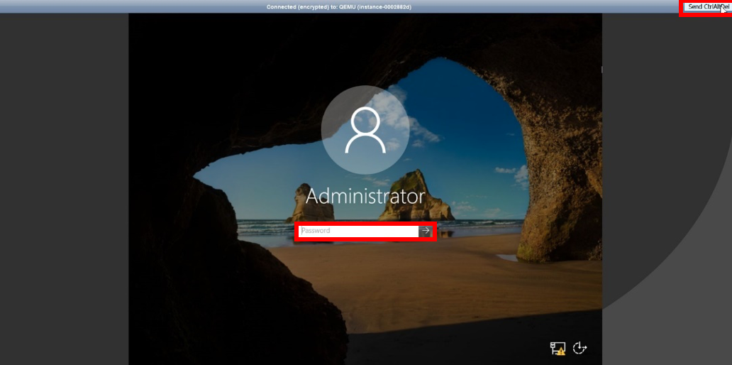 「Send+Ctrl+Alt+Del」キーを押下し、設定したパスワードを入力して資材サーバーにログインします。