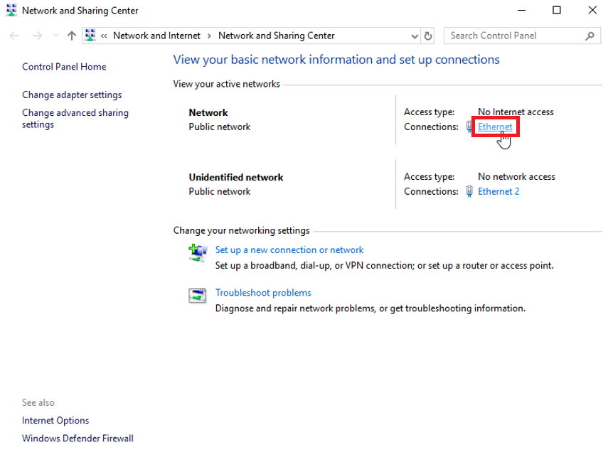 「Network and Sharing Center」画面にて、インターネットに接続できるインターフェースをクリックします。