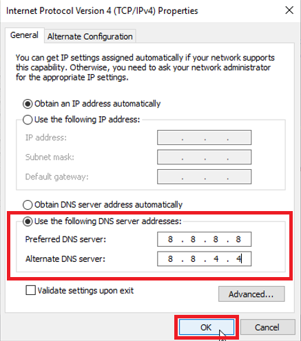 [Use the following DNS server addresses:]にチェックを入れ、DNSを設定し、[OK]をクリックします。