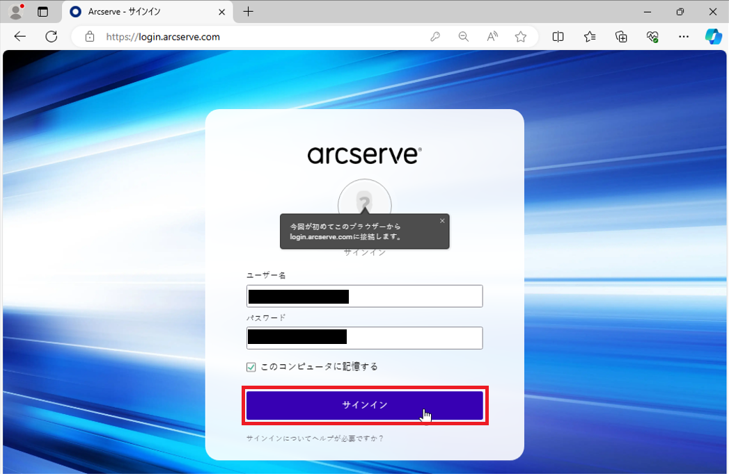 一時設置サーバーのブラウザにて「https://login.arcserve.com/」にアクセスし、登録したユーザー名とパスワードを入力し[サインイン]をクリックします。